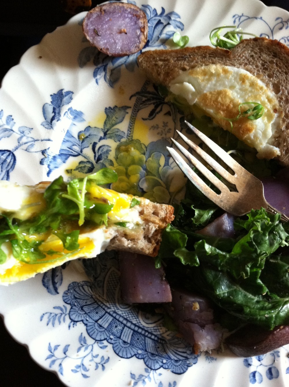Another variation includes havarti cheese and microgreens, with rosemary garlic (purple!) homefries and curly kale. Did I mention bacon fat?? Love Saturday mornings… š