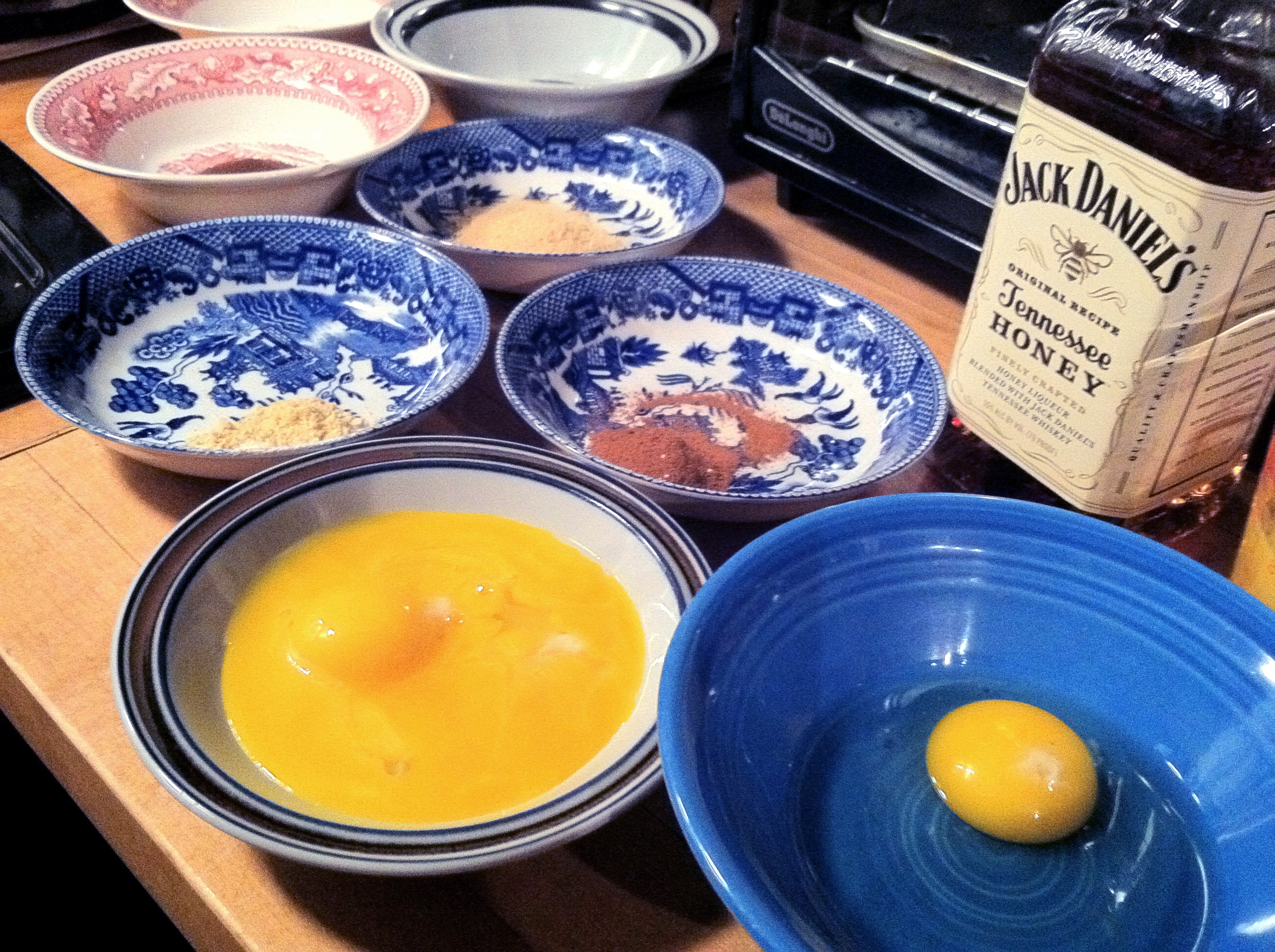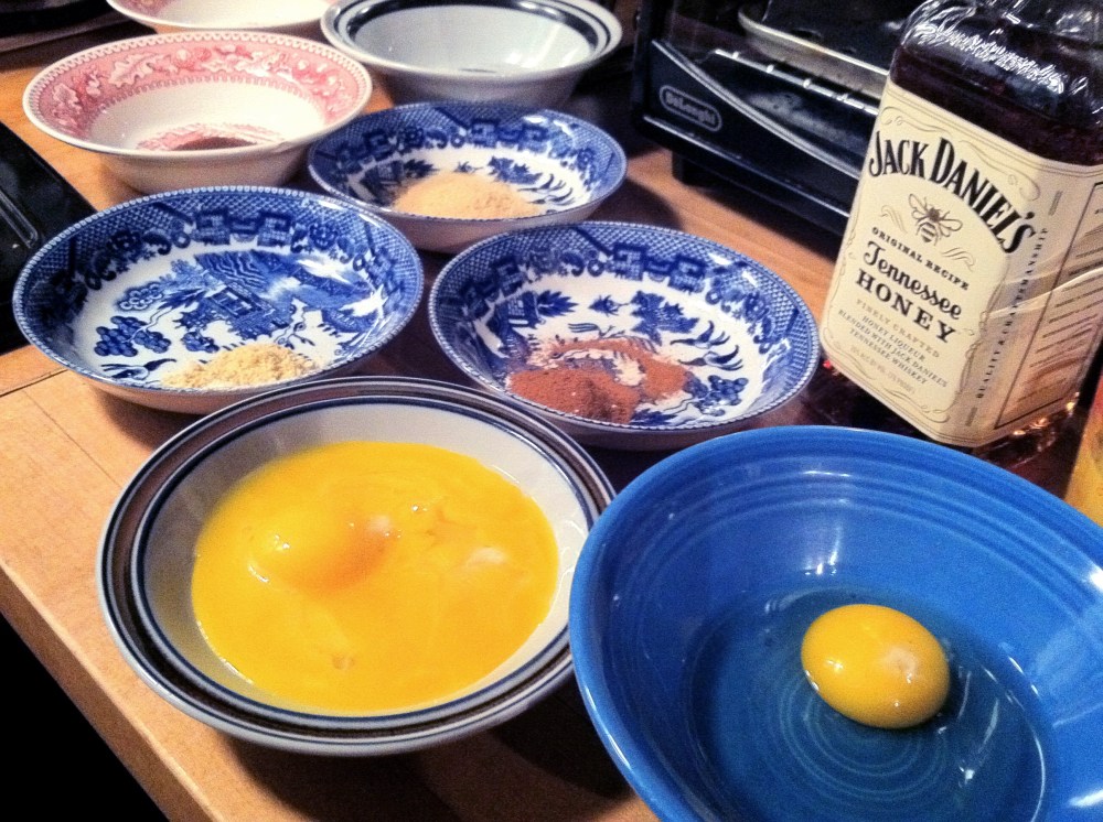 In a medium bowl, whisk together the egg yolks, sugar in the raw, and salt until well combined. (Save the egg whites for an omelete or some other use in the next couple of days.) In a medium saucepan, heat the milk over medium-low. Be careful to stir it while it heats to avoid the formation of skin on top – yuck. Whisk about half the warm milk into the egg yolk mixture; then whisk the yolk mixture into the milk in the saucepan. Cook, whisking constantly, until the custard is thick enough to coat the back of a spoon. If you’re doubting that it’s coating the back of a spoon, it probably isn’t yet. The book says it takes about 10 minutes, but for me, it took about 15. Remove from the heat and stir in either the bourbon (book’s recommendation) or honey whiskey (I vote honey whiskey). Cool to room temperature, and then chill until ready to serve.
