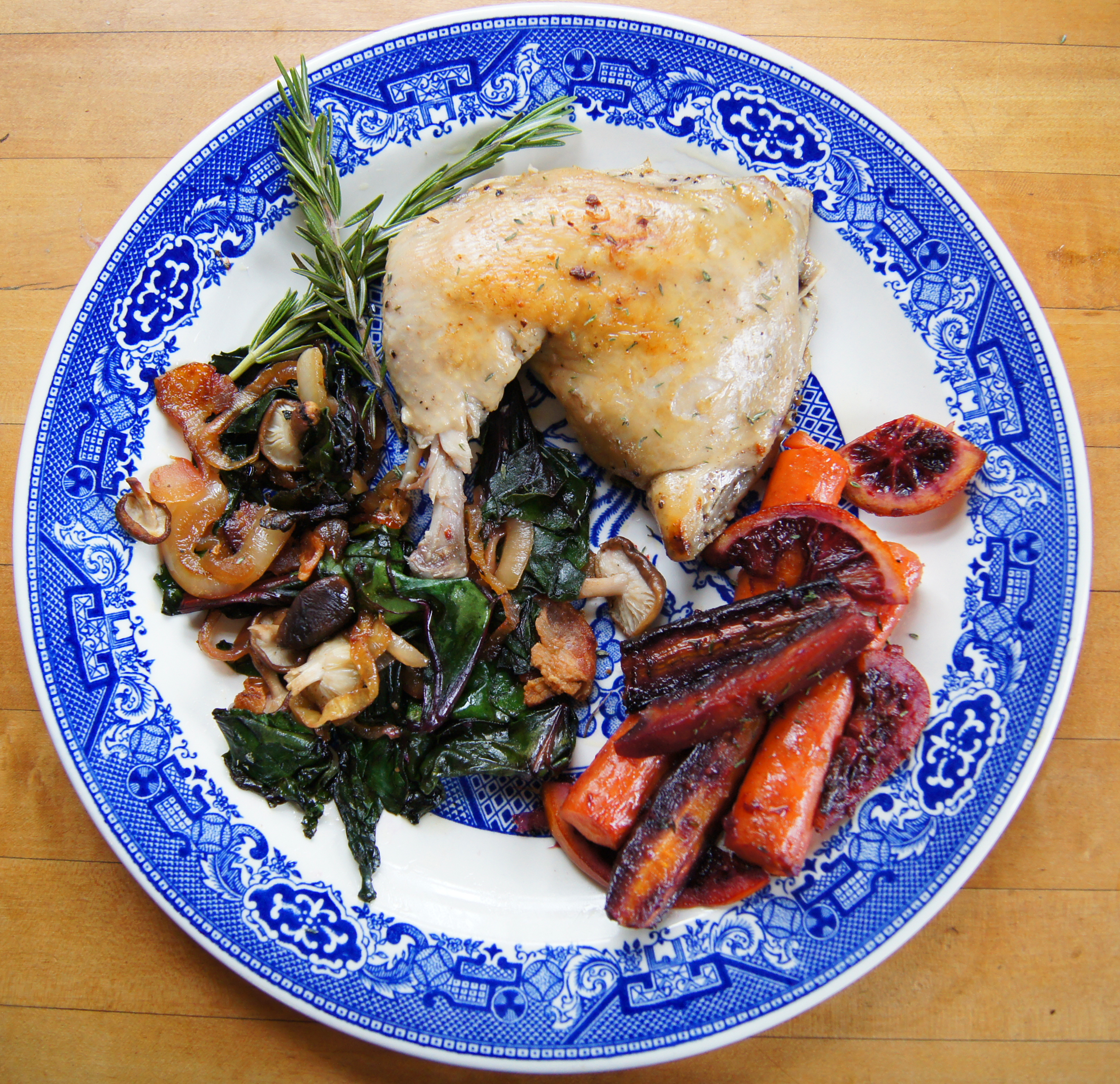 This recipe is dairy- and gluten-free, with local produce and chicken. AKA Paleo-friendly! It can be kind of frightening making it since it calls for so much fat, but they’re healthy fats…and it’s delicious, so dive in! This is a cheater’s version of confit. It would normally be cooked in chicken fat, or goose or duck fat if you have access to that, but it needs to sit for a few days prior to cooking. So, this version uses olive oil for the chicken confit and coconut oil for the carrot confit, and can be prepared and cooked on the same day. It can be eaten off the bone, shredded into a sandwich or salad, or eaten any way your heart desires really.