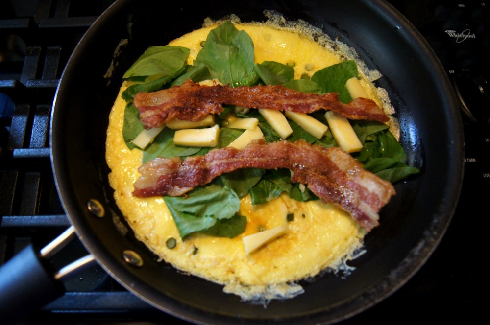 I cooked the cayenne-spiced bacon while starting up the omelette, to ensure it got nice and crispy. Over low heat, sautee the garlic scapes in butter until fragrant. Pour in the eggs and make sure the garlic is spread out evenly. It’s really important to keep the heat low and just be patient. I’m sure the way I make omelettes is different than some, but I typically let it sit for a couple minutes, then turn the pan 90 degrees to get even heat before flipping it. After flipping, it really only needs enough time to add the rest of the ingredients and heat for a second, before folding in half and devouring. Throw on the raw pea tendril leaves, cheese, and two slices of bacon. The pea tendril leaves are so delicate that just the heat of the eggs will cook them enough, and save the flavor. You’ll want to save the flowers for the side since they’re just so pretty, but still edible. If the bacon is crispy enough, you can just add the slices whole like I did, and they’ll break apart easily. Pepper if you want it.