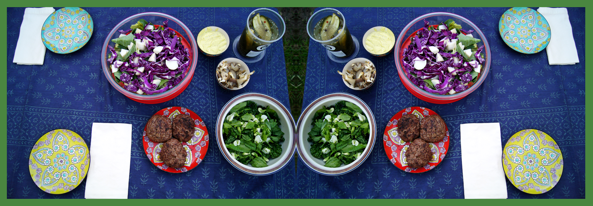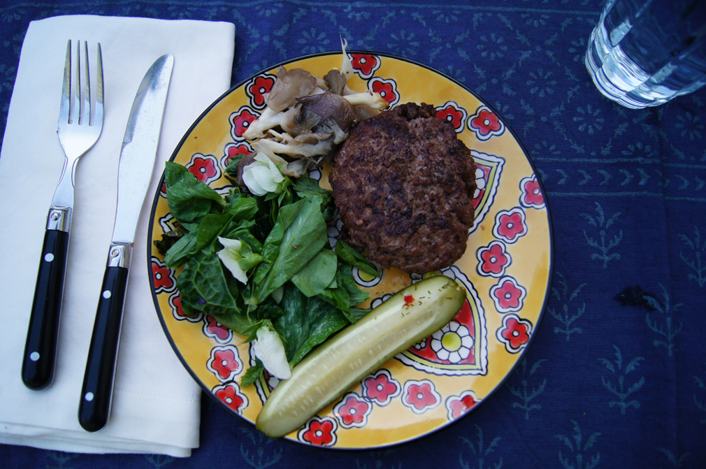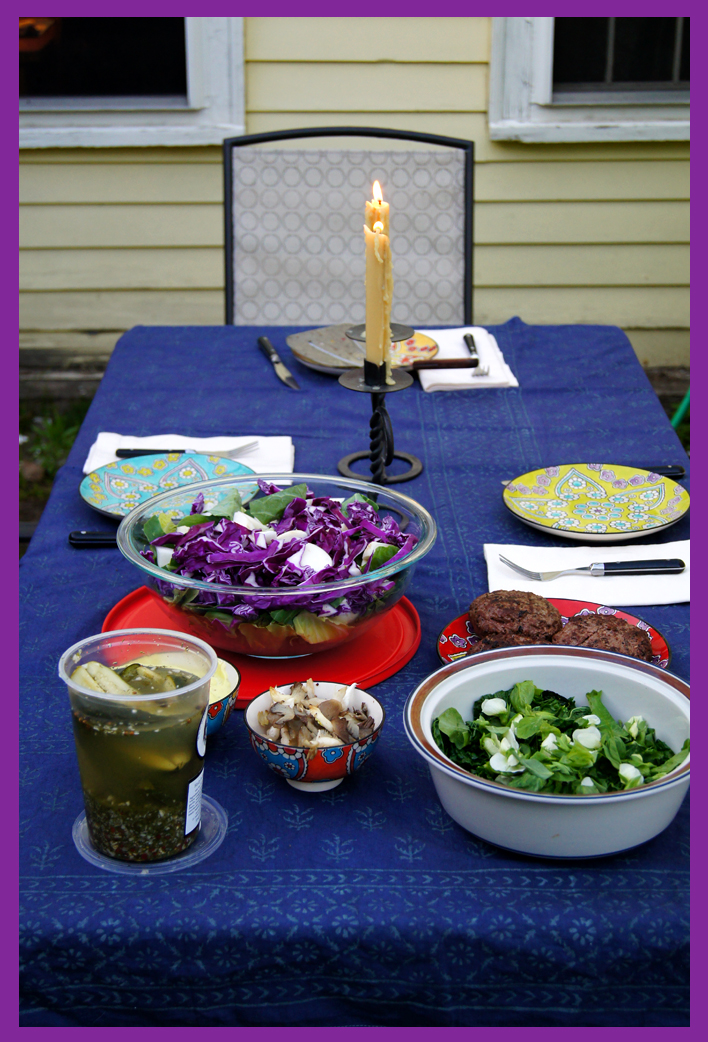 Lacinato kale sauteed in duckfat with pea tendrils added after cooking…Shady Oaks Organics oyster mushrooms also sauteed in duckfat…Maitland Mountain Farm spicy pickles…salad of green and purple cabbage, salad turnips, and red leaf lettuce with green garlic aioli…and grass-fed burgers, with more aioli…