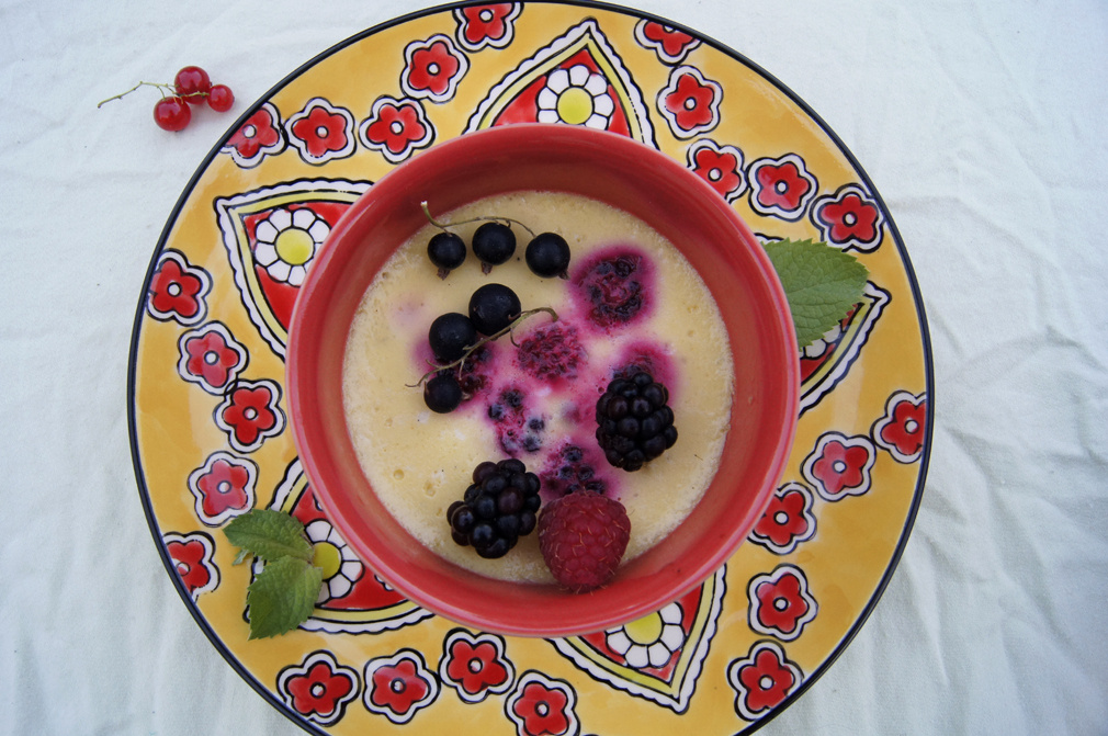 Divide the berries and currants amongst six 6-ounce bowls or ramekins. Pour custard on top. Place the ramekins on a deep baking pan. Pour boiling water into the pan, enough to go up about 1-inch up the sides. Bring the pan into the oven and bake for about 25 minutes until custard is set. Let cool completely. Serve at room temperature or chilled.