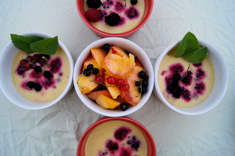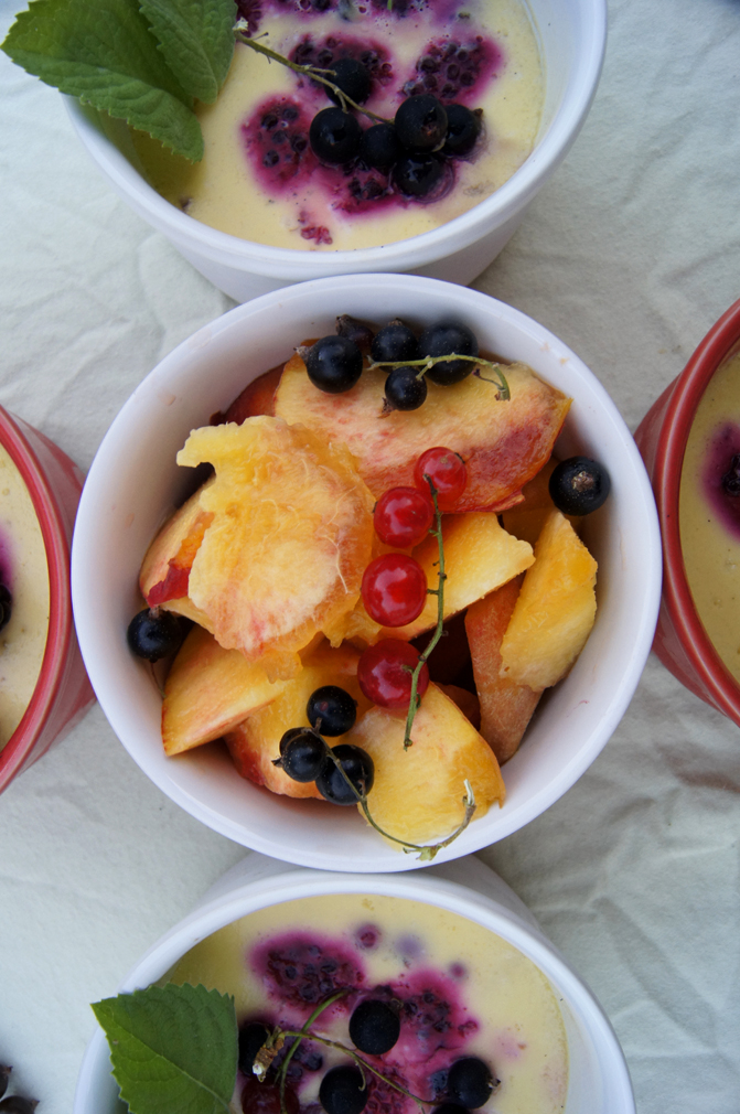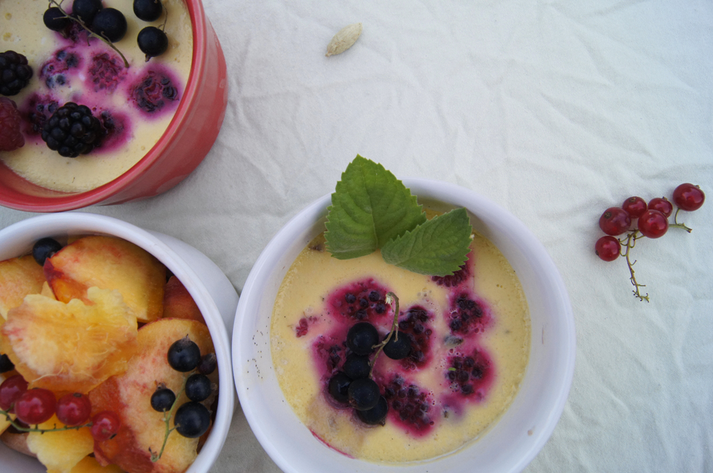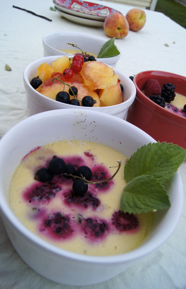 I can’t get over how delicious this custard is. It’s really one of those desserts that the list of ingredients speaks for itself. Fresh, sweet, refreshing, and a hint exotic. This great recipe is from Cannelle et Vanille and I just love it. It’s one of those recipes that you dream up a thousand variations for – I will definitely be revisiting this throughout the year as the seasons change, with different flavor bases and fruits.
