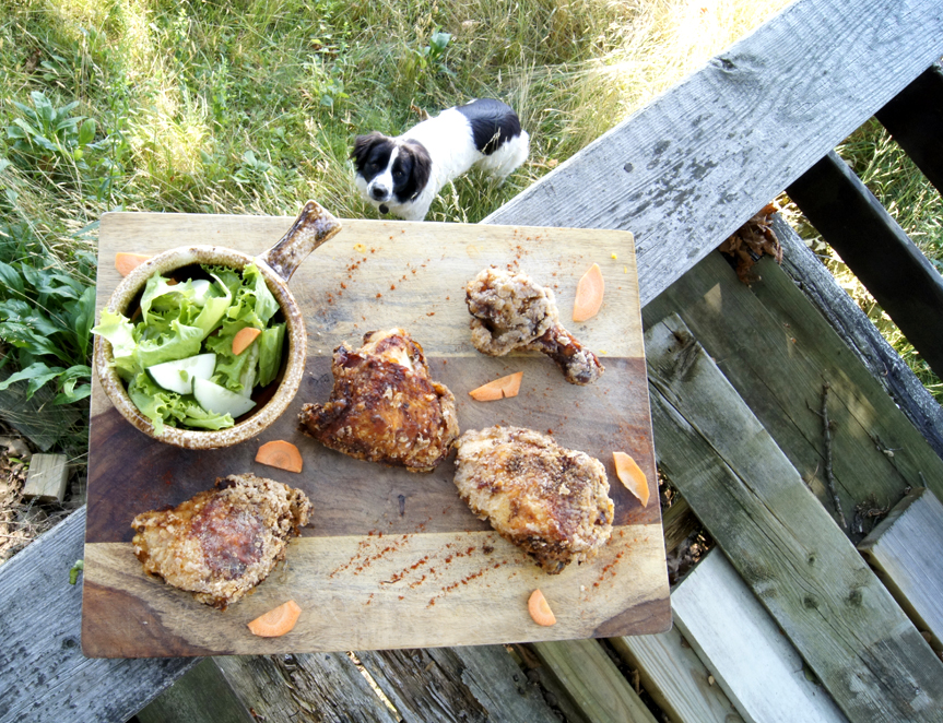 As you’re frying the chicken in batches, put the oven on 200 to keep the cooked pieces warm while you finish the rest. Invite some friends over – or go to a friend’s place with a view like I did, haha…and enjoy! And good luck trying to fight the dogs for the leftovers…persistent pups.