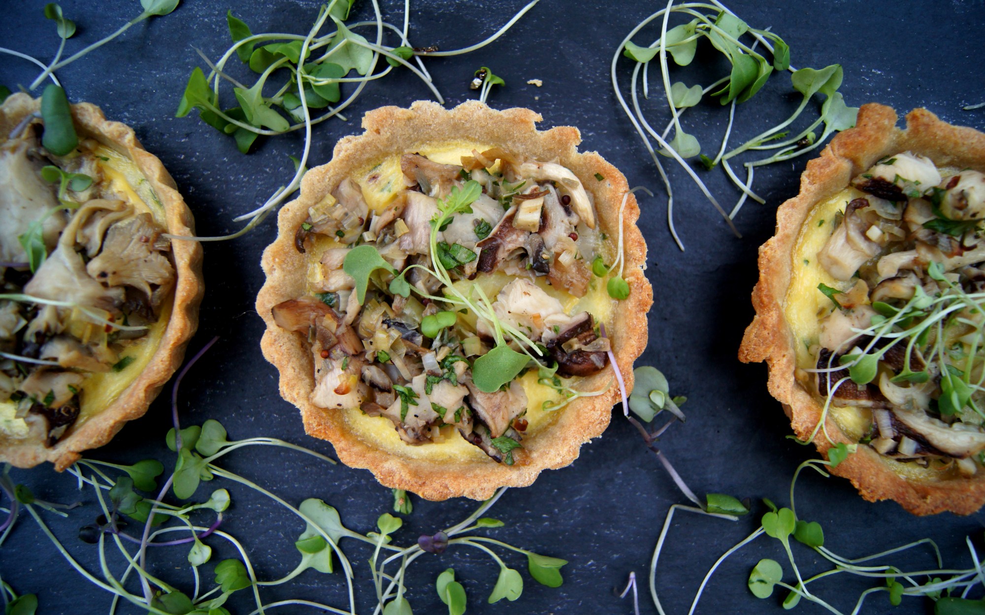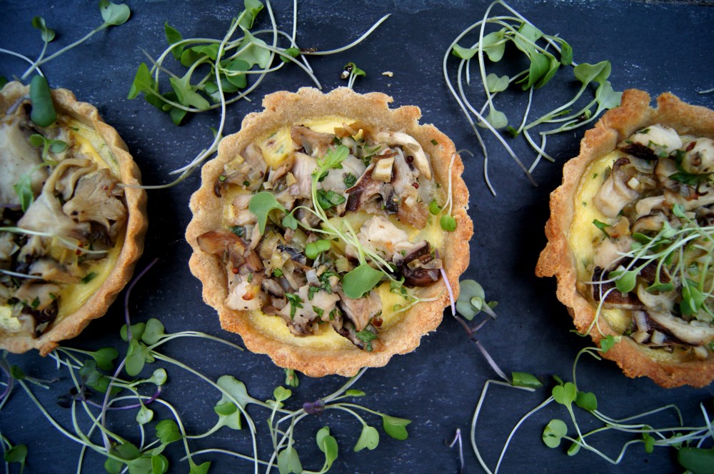 Divide the egg batter among each mini-tart, place the potato and Jerusalem artichoke slices on top, and bake for 10 minutes at 350F. Remove from the oven and top with the mushrooms and cheese, then bake for another 15 minutes.