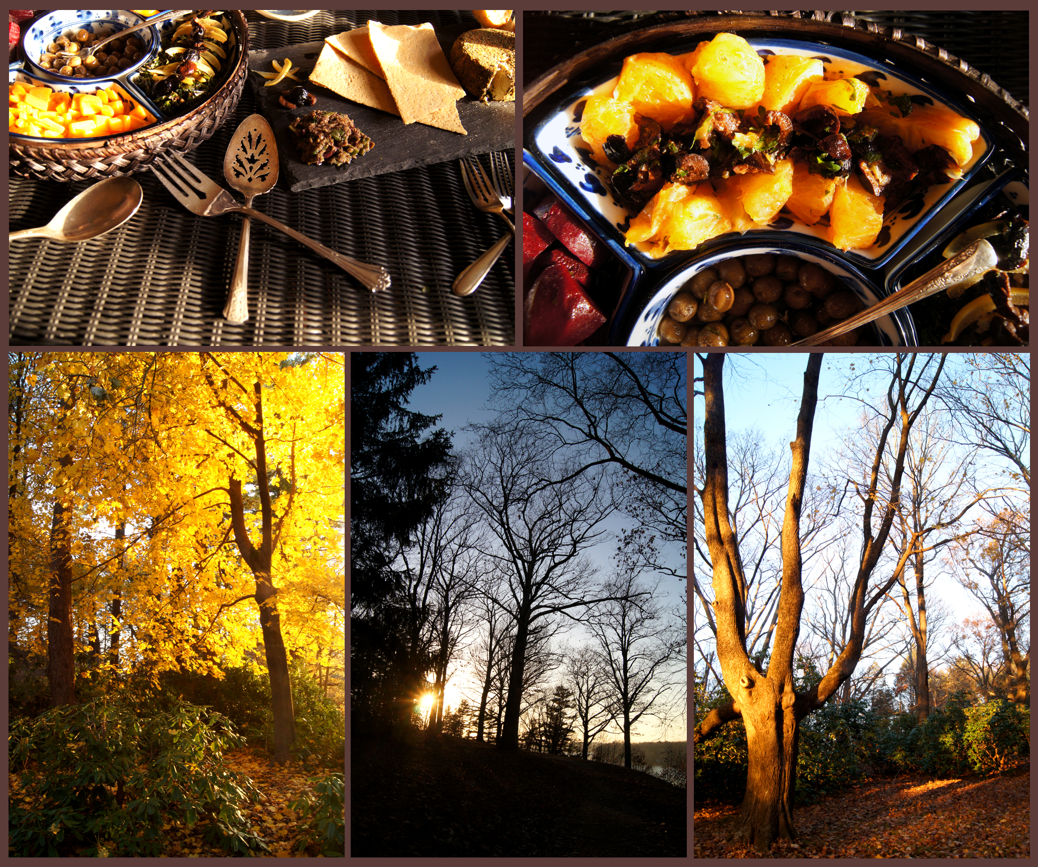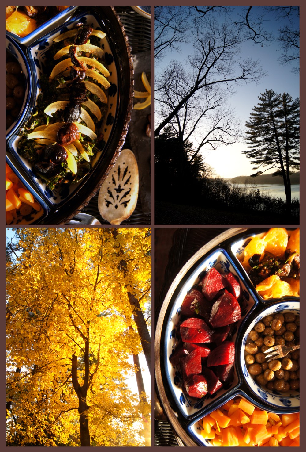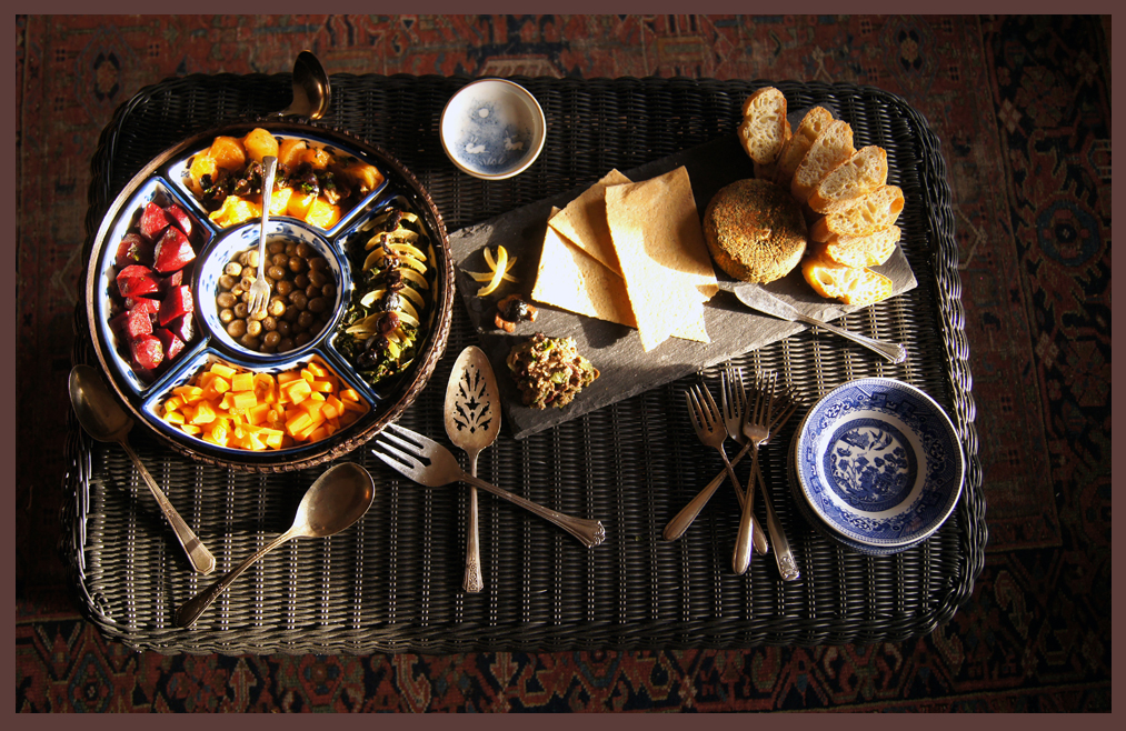 The salads were simple, yet subtly exotic. It was great being able to set them out and not worry about the temperature, while I worked on the rest of the meal. I won’t try to pretend it was a cinch pulling this all together; I didn’t put the time in to prep in the days leading up to Thanksgiving, aside from shopping, and falling asleep without doing any preparations the night before (most importantly seasoning the tagine, more on that in the next post) meant I needed to get up at 3:45 to be organized.