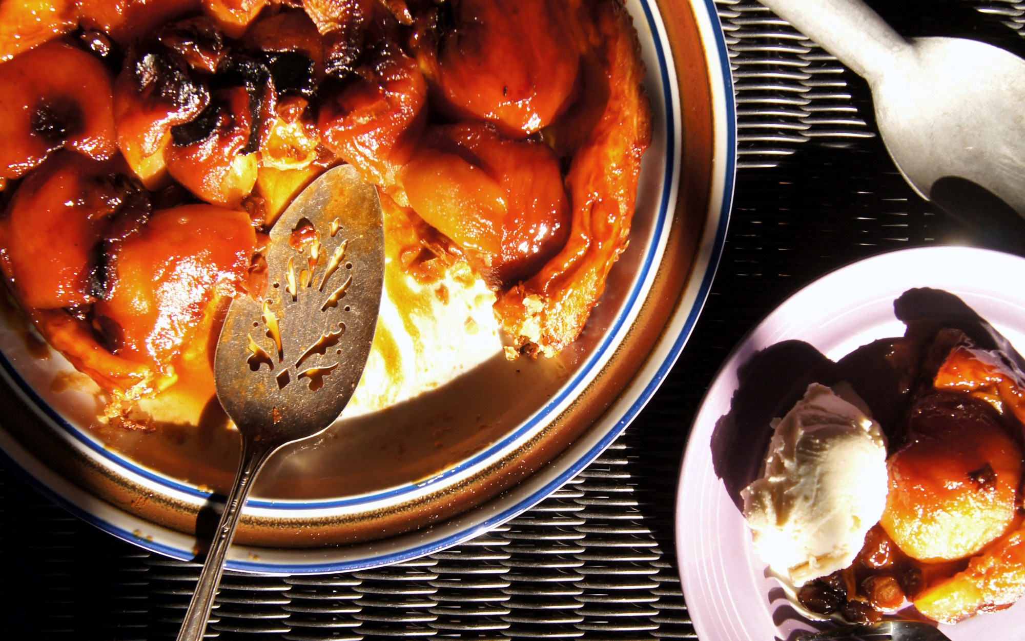 - Remove the tart from the oven and let it settle for a few minutes. Place a large round/rimmed platter over the tart, then quickly and carefully invert the tart onto the platter. Gently tap on the bottom of the pan to loosen any apples that may have stuck. If any apples still stick to the pan, loosen with a thin spatula and set them back onto the tart. Wait for 10 or 20 minutes, then serve warm with creme fraiche or vanilla ice cream.