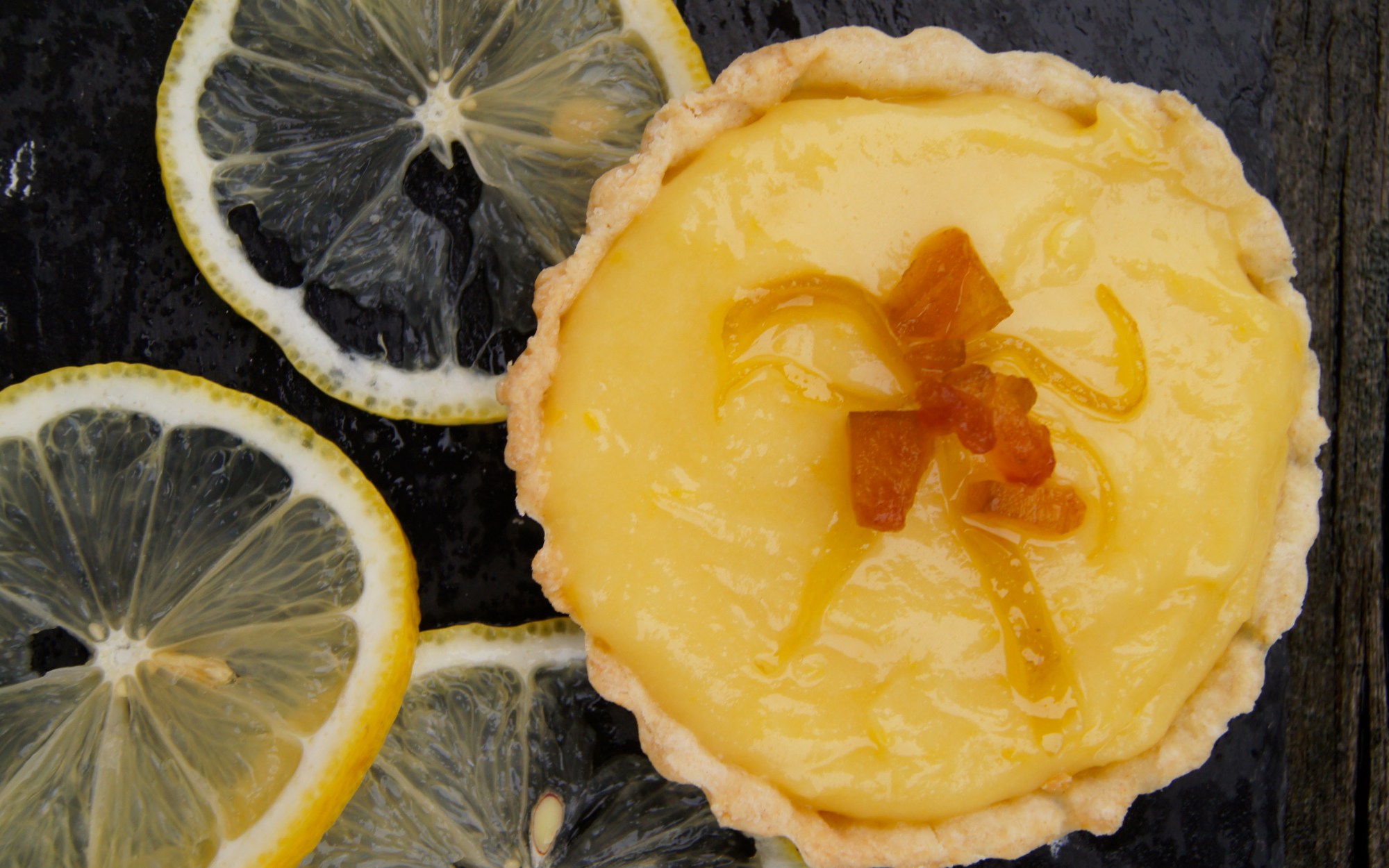 - Once the crusts are cold, fill them with lemon cream. Level it and add the candied peels on top. Let cool a little before serving.