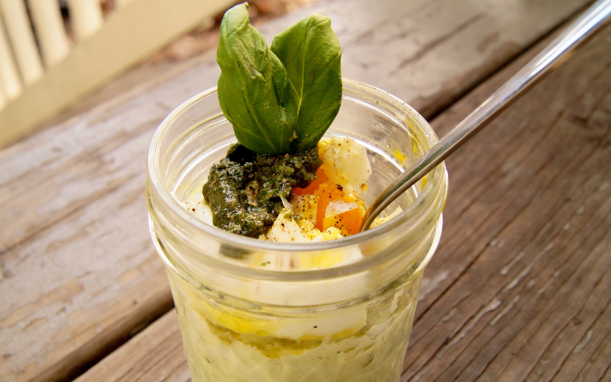 Mix in a bit of the pesto into the yogurt – enough so the yogurt has just a hint of green – with a little extra dollop on top. Gently place the egg on top, with a splash of olive oil, lemon juice (optional) and salt and pepper to taste. Feel free to add more pesto if desired. And when that yolk runs through the yogurt — yum.