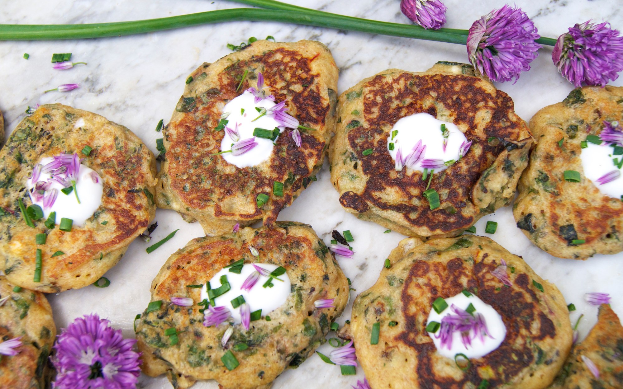 When finished, give each cake a little spoonful of thick yogurt, some diced chives and chive blossoms, or whatever herbs you plan to use. A few diced, roasted mushrooms would also be tasty on top of the yogurt. Enjoy!!