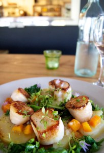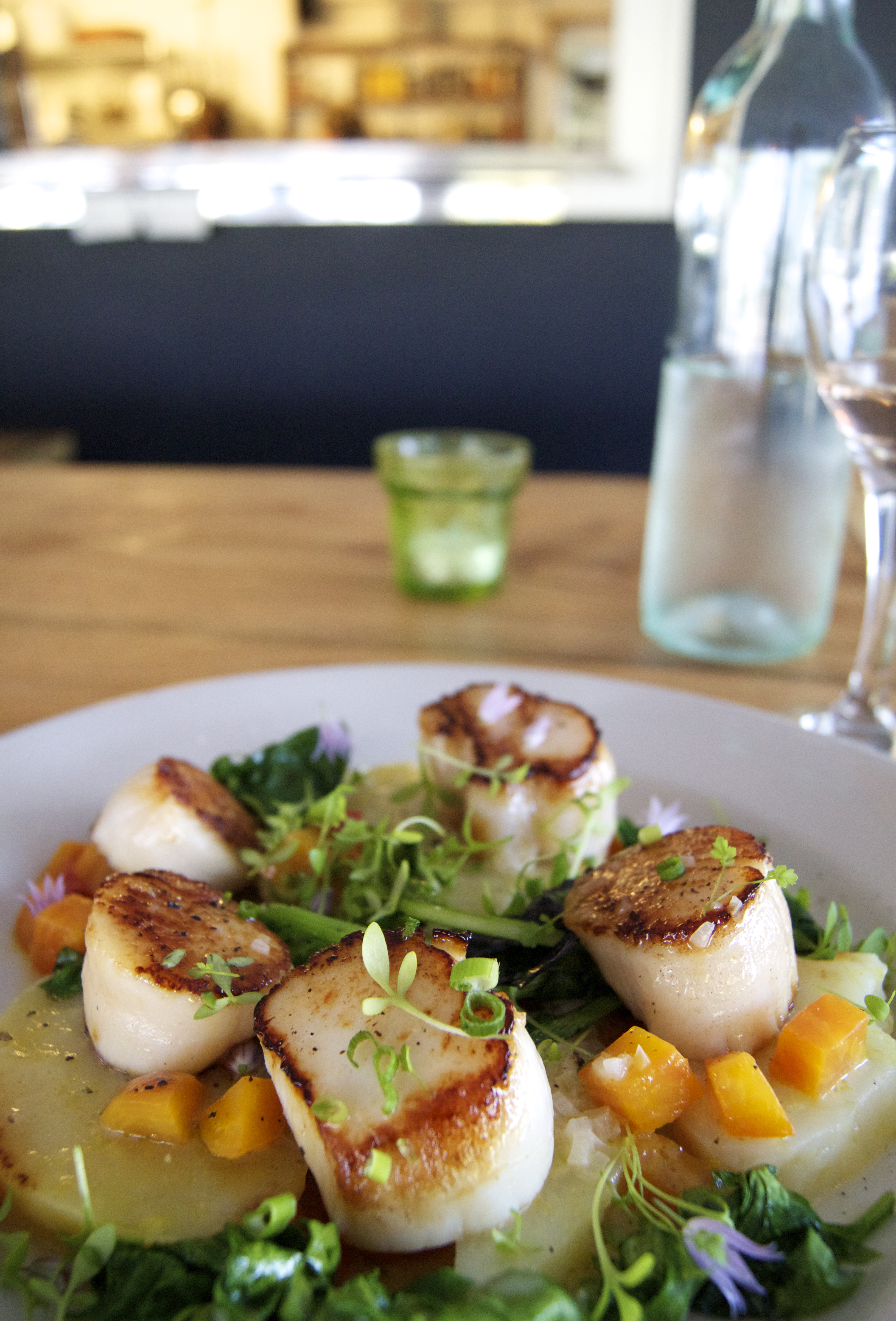 seared scallops with marinated potatoes, beets, and braised greens