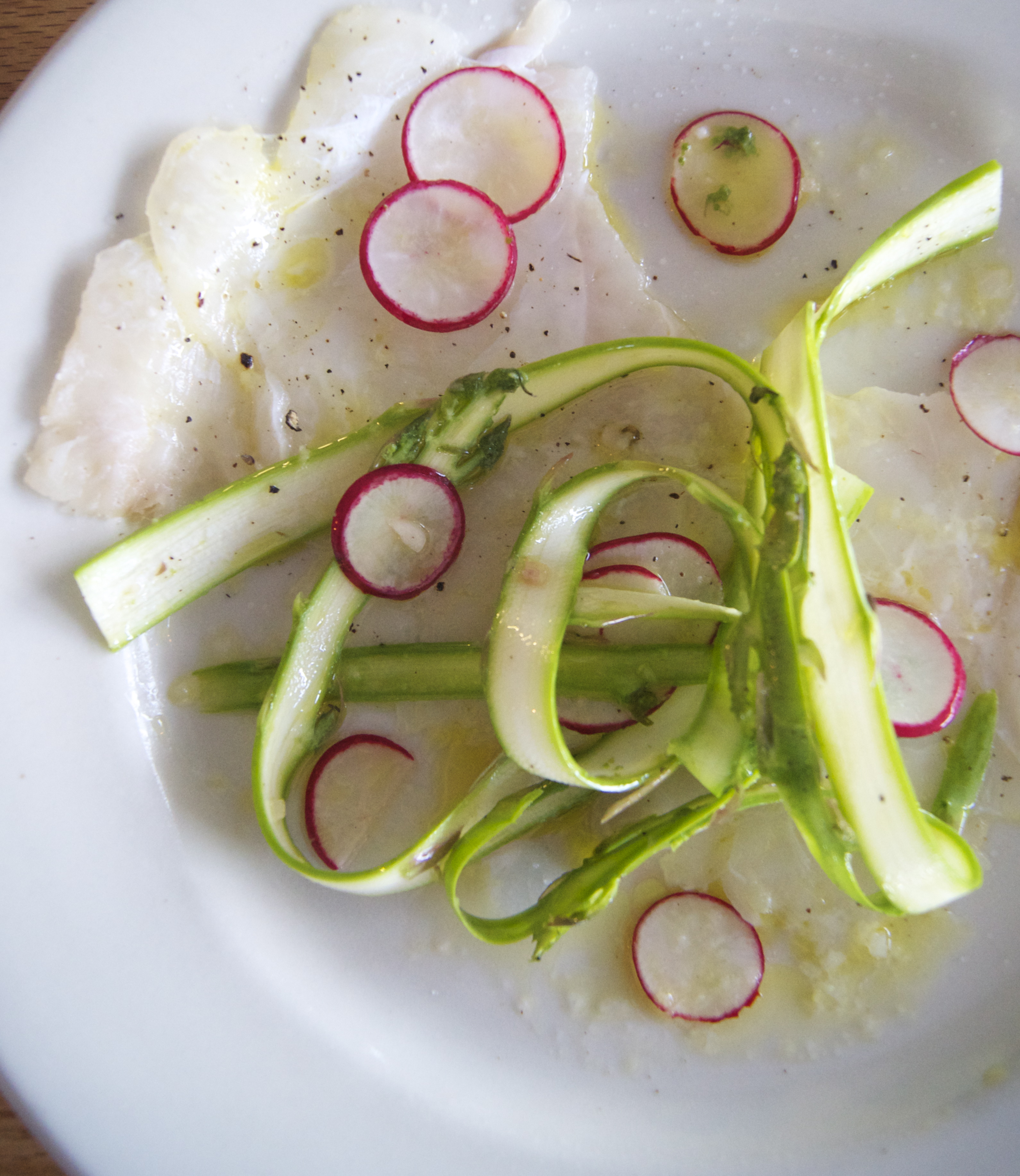 halibut carpaccio with radishes, slivered asparagus and ginger vinaigrette