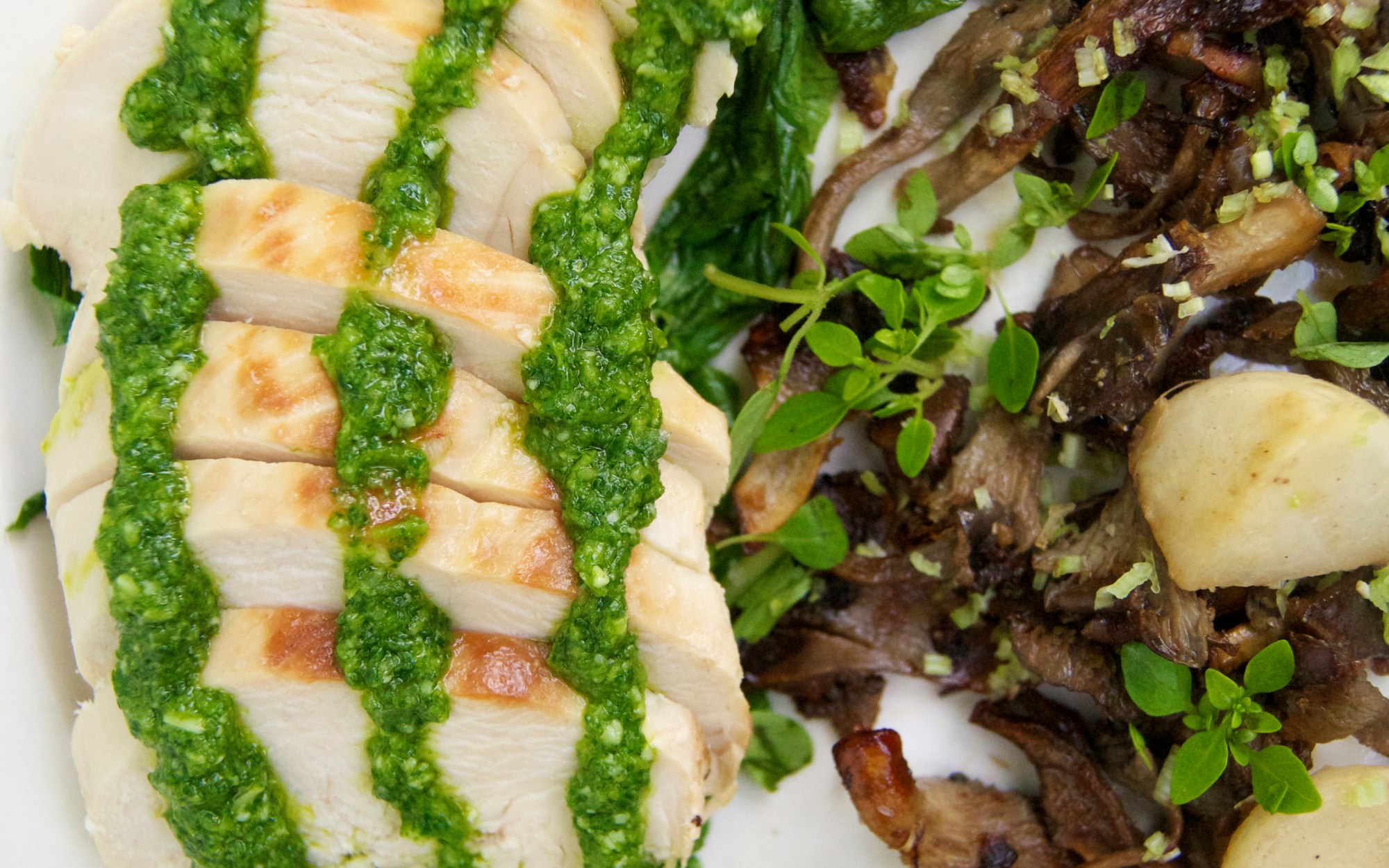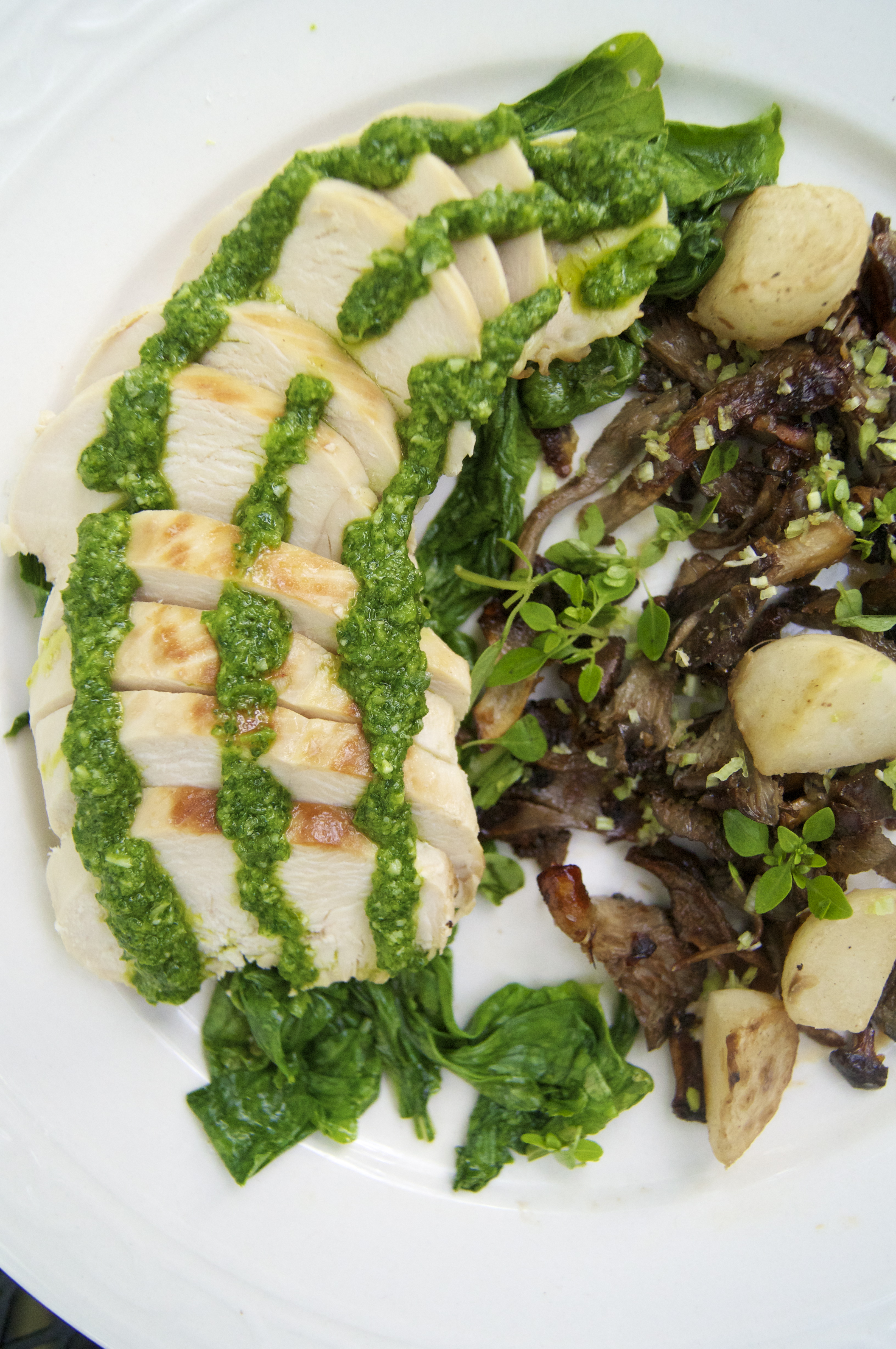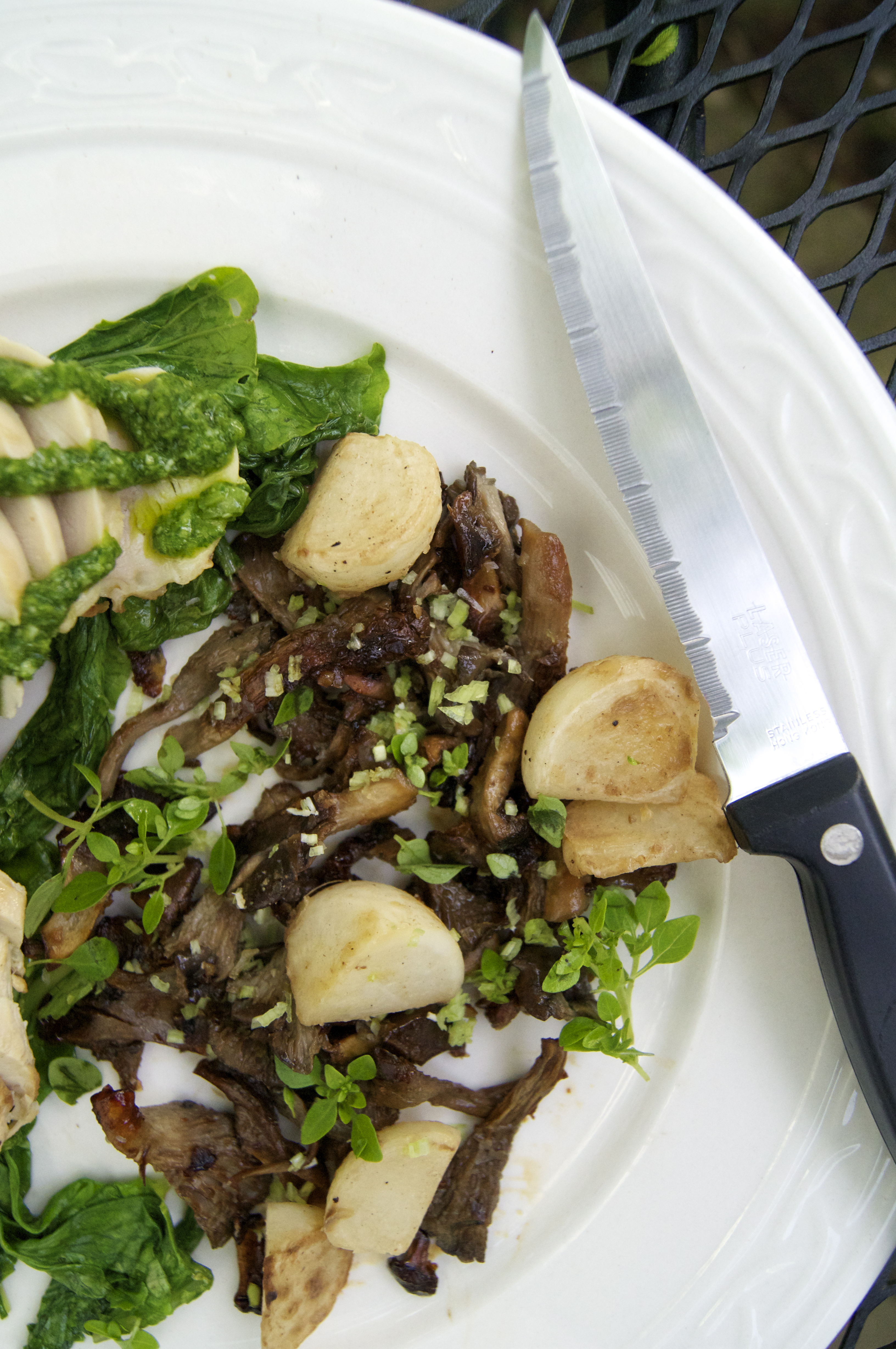 Smother it on chicken, fish, burgers, eggs, grilled cheese, pizza, pasta…really, almost anything savory could use a little pesto love! I seared then roasted Tendercrop chicken breast, roasted oyster and mini king trumpet mushrooms from the NH Mushroom Company in the fat from the chicken with green garlic (Middle Earth Farm), and sautéed turnips and their greens in a cast iron, super fresh from Plough in the Stars Farm. Roasted salad (or haruki) turnips are incredibly good. While I love them raw, roasting them gives them a tender juiciness that is just so good.