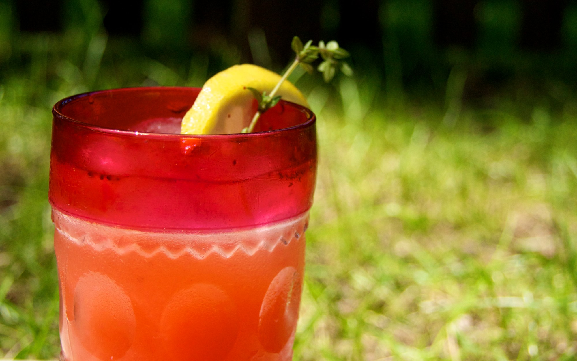 If you’re feeling ambitious, you could certainly make your own fresh lemonade. I just used Newman’s Own, and it turned out quite yummy. Shake all ingredients with some ice, pour and garnish with a lemon slice and thyme sprig.