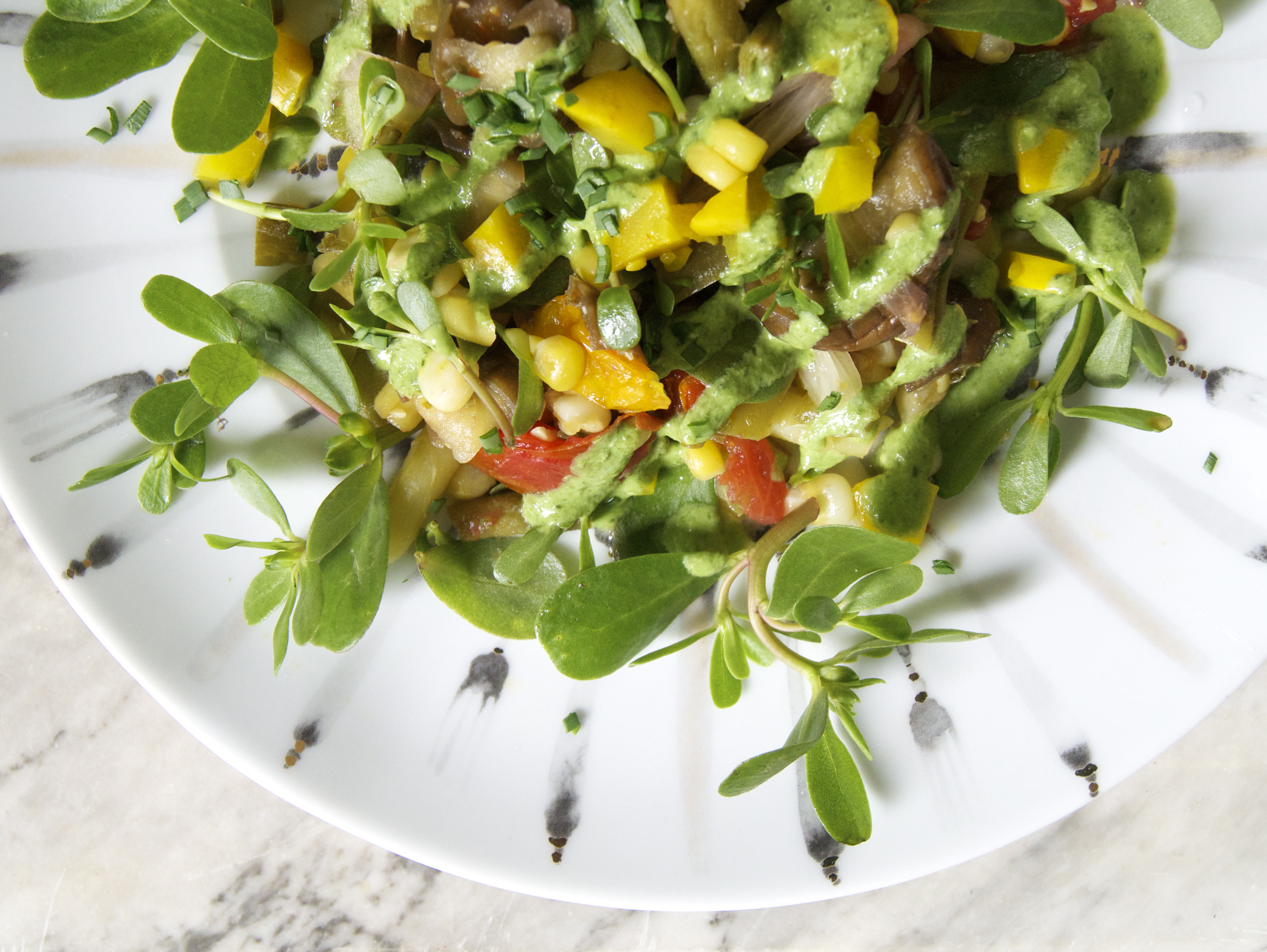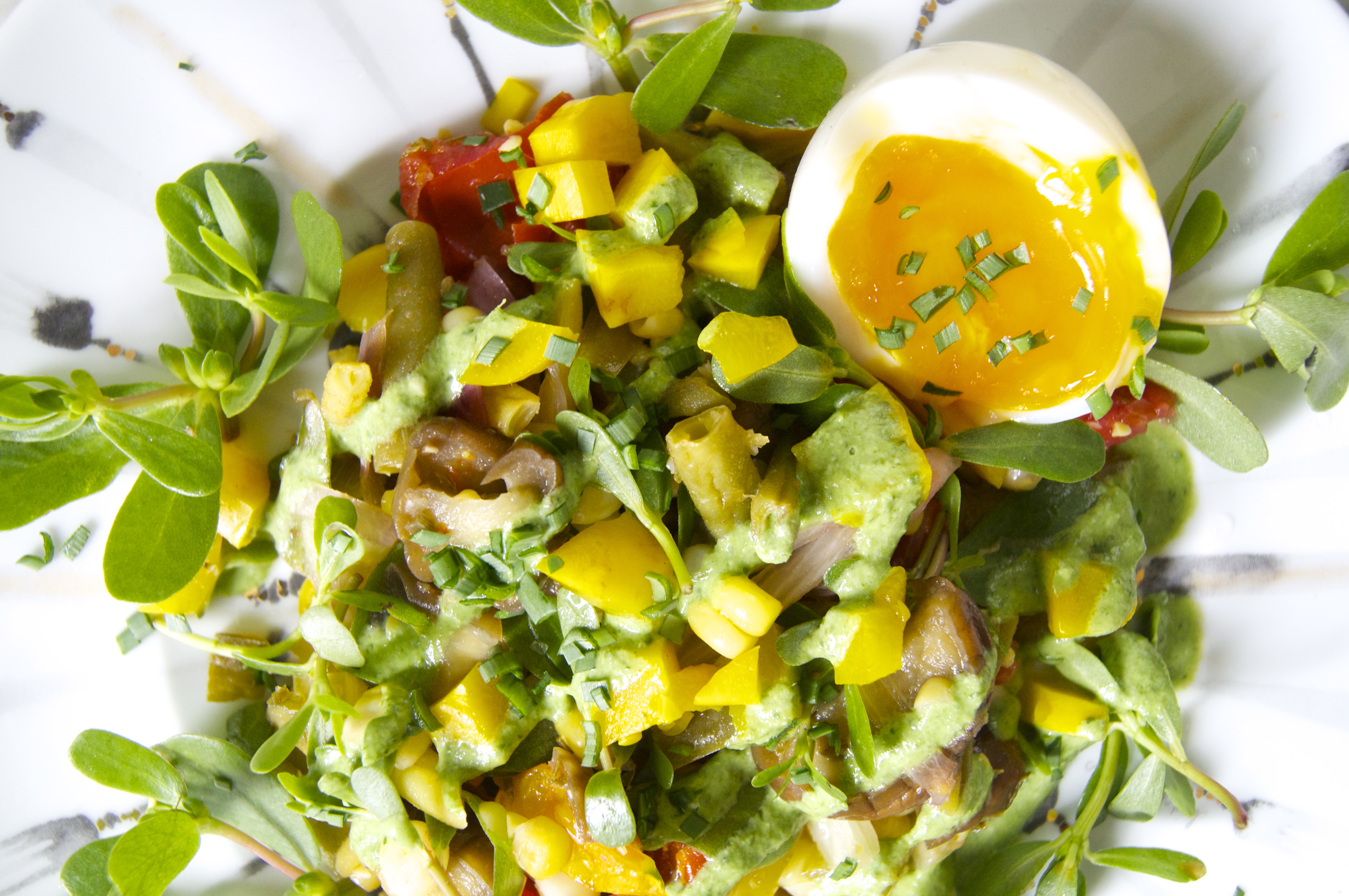 I’m so happy to have learned about purslane! The succulent leave on the edges of the plate above are commonly thought of as a weed, as they show up and grow prolifically. Last year, I saw it popping up everywhere around the yard, got excited and thought it might be something good, and then heard it was a weed and pulled it all out. But it’s actually a very beautiful, tasty plant and is super good for you to boot. It kind of tastes like spinach, but the succulent leaves give it a nice bite. We serve it at The Market Restaurant! Tons of omega-3s, vitamins and minerals — an easy source of those wonderful fatty acids.