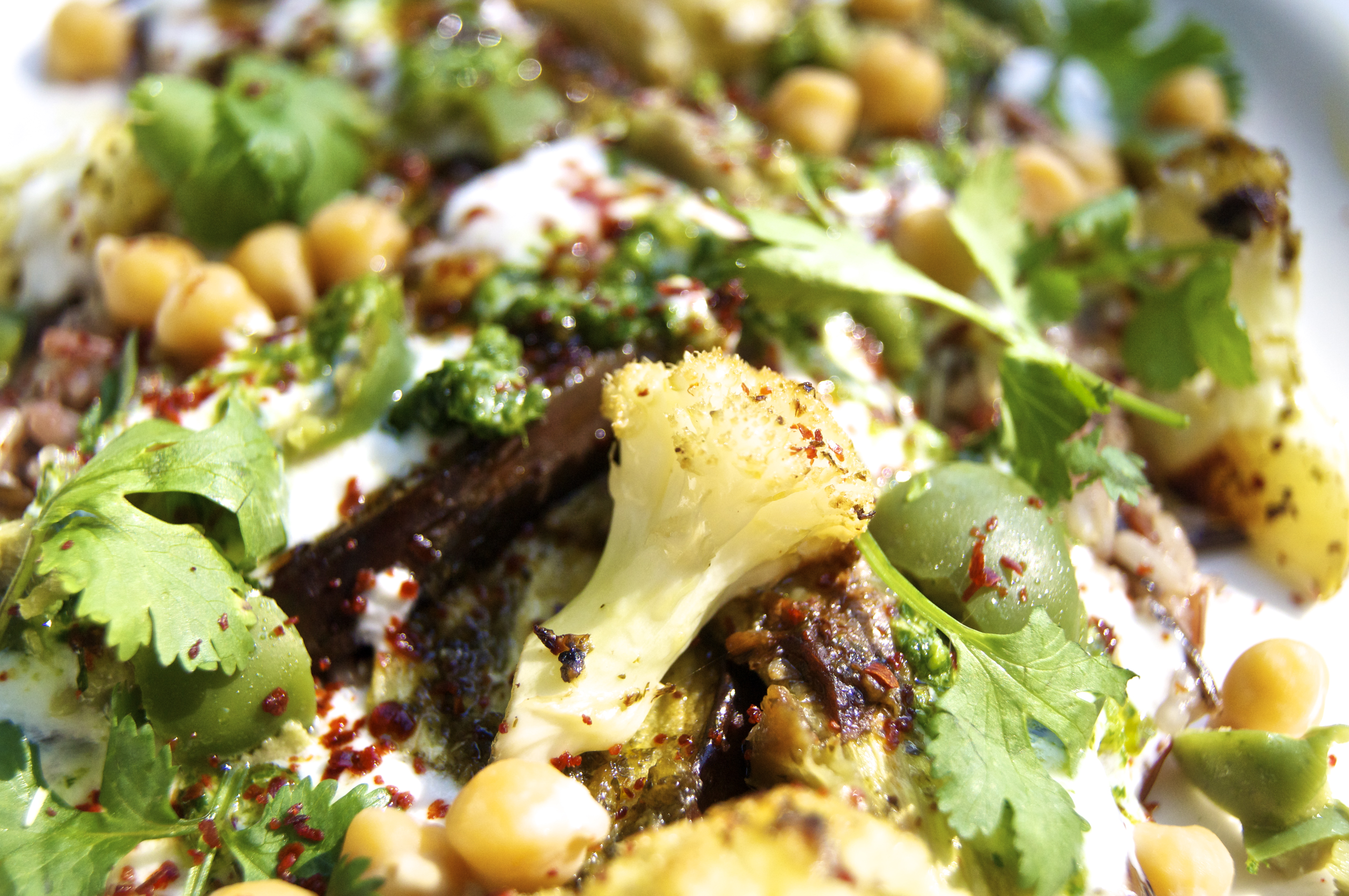 Roasted Eggplant with Chermoula, Yogurt, and Cauliflower