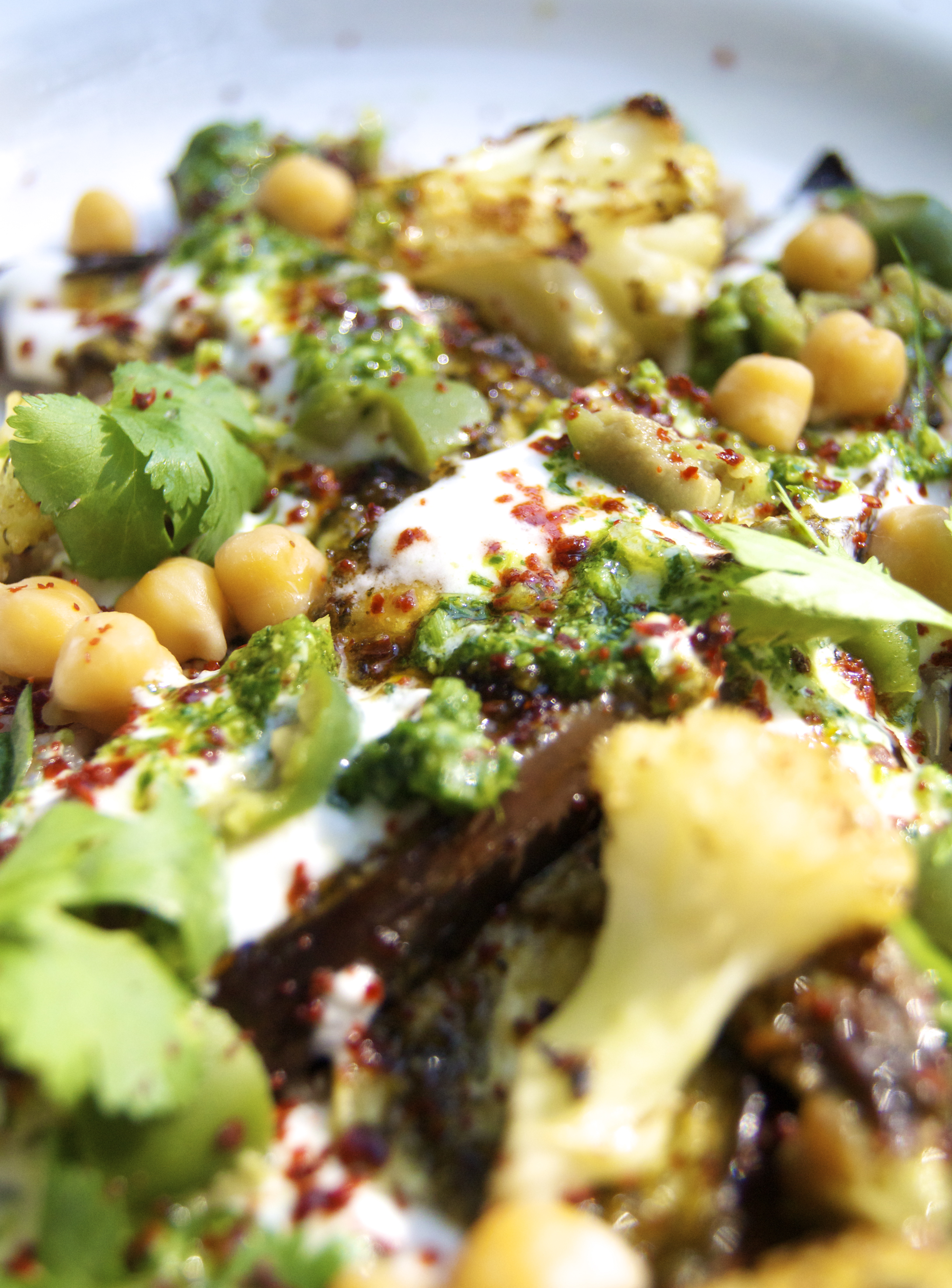 When everything is done, plate with a little drizzle of yogurt and more chermoula on top. Scatter the chopped olives and some chickpeas around the plate, sprinkle everything with marash pepper and garnish with the ol’ cilantro springs. Yep, this makes me a very happy, nourished girl. I think after I have a second helping I may be able to venture back into public again. Wild.