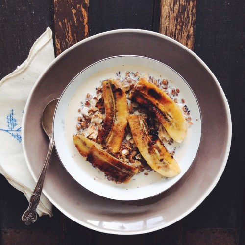 quinoa, amaranth, and brown rice porridge with caramelized banana and coconut