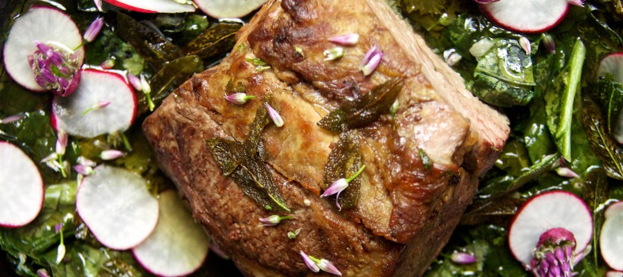 Braised Tendercrop Pork, Mustard Greens, and Radishes